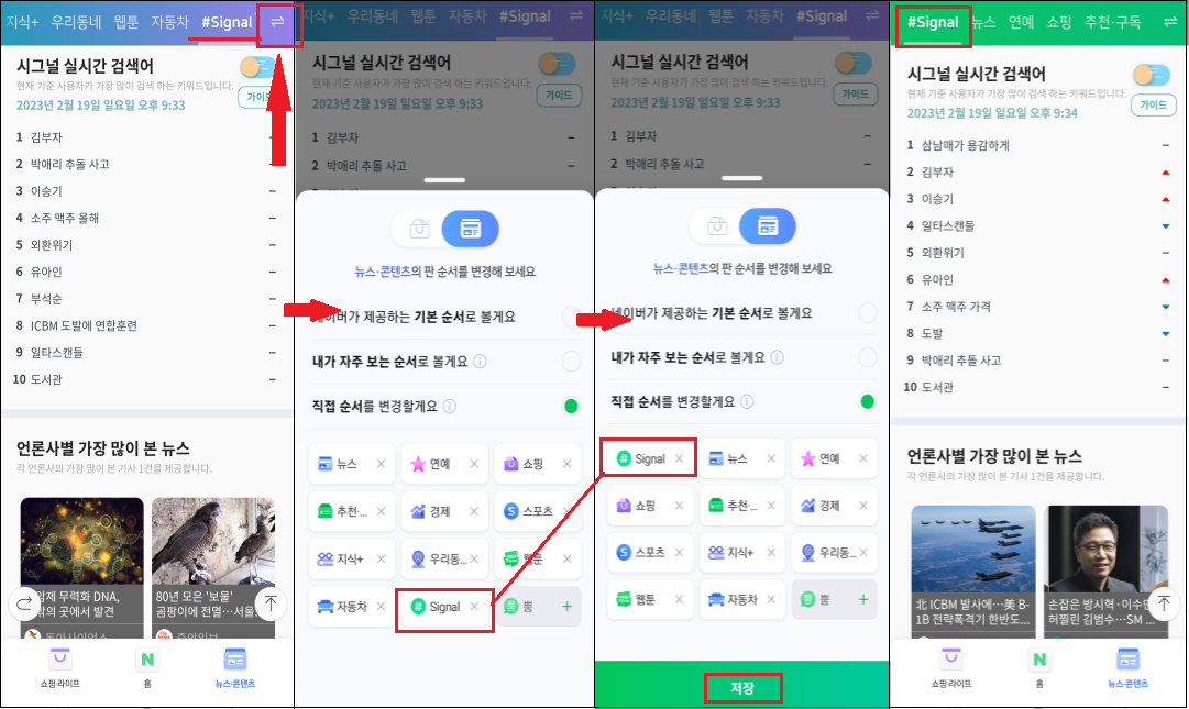 네이버 홈화면에 설치하고 나면 오른쪽 상단의 화살표를 이용해서 메뉴 맨 앞으로 옮길 수도 있습니다. 그러면 네이버 앱을 열었을 때 실시간 검색어를 바로 볼 수가 있습니다.