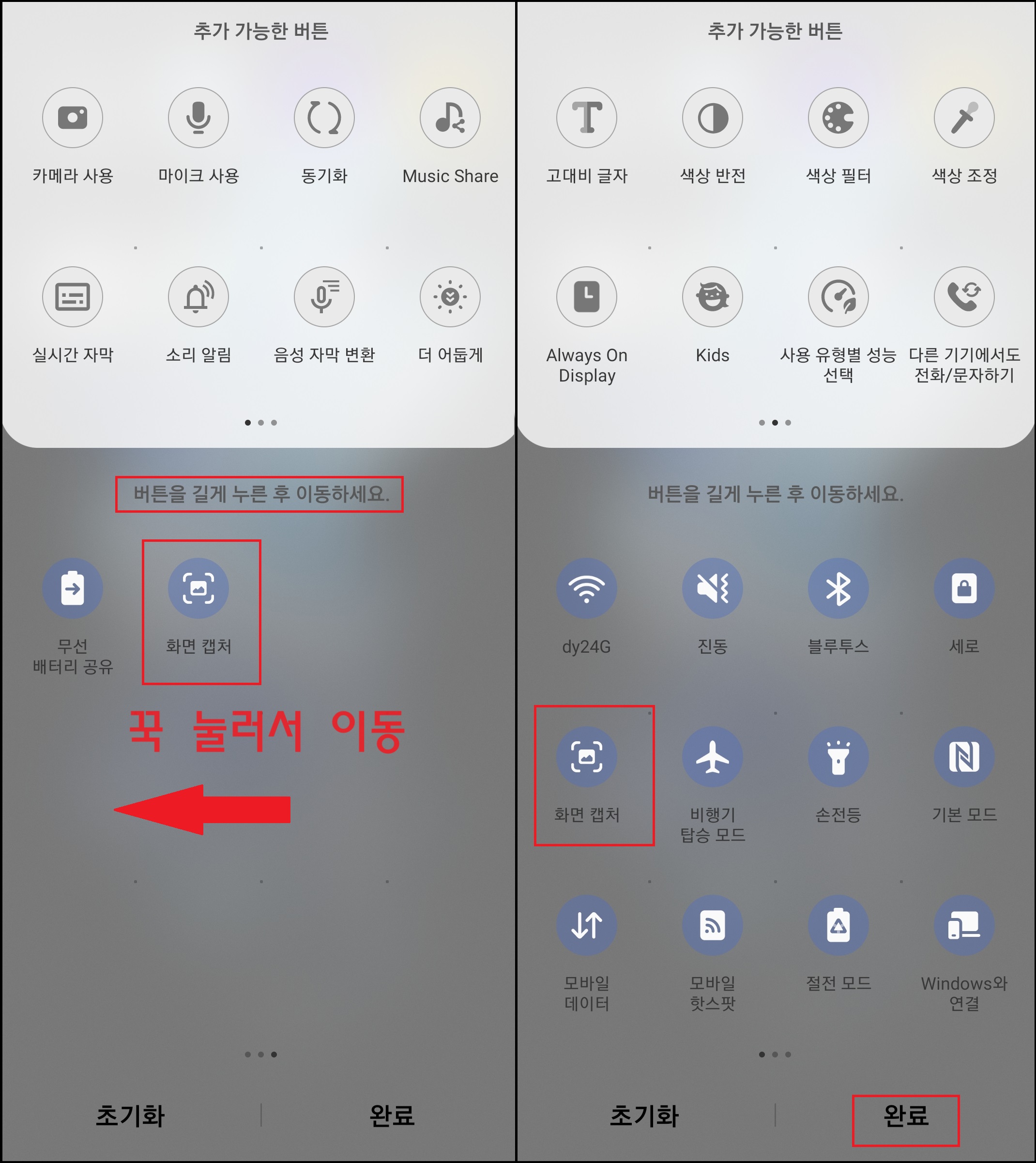 버튼을 이동할 때 길게 누른 상태(손가락을 떼지 않고)에서 아래로 이동합니다.